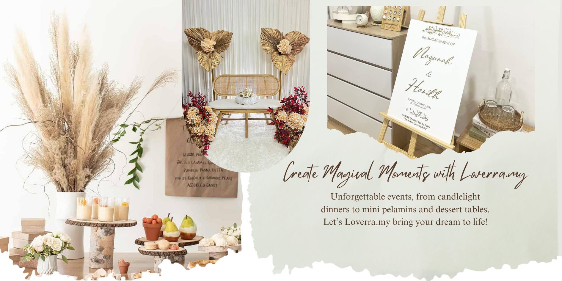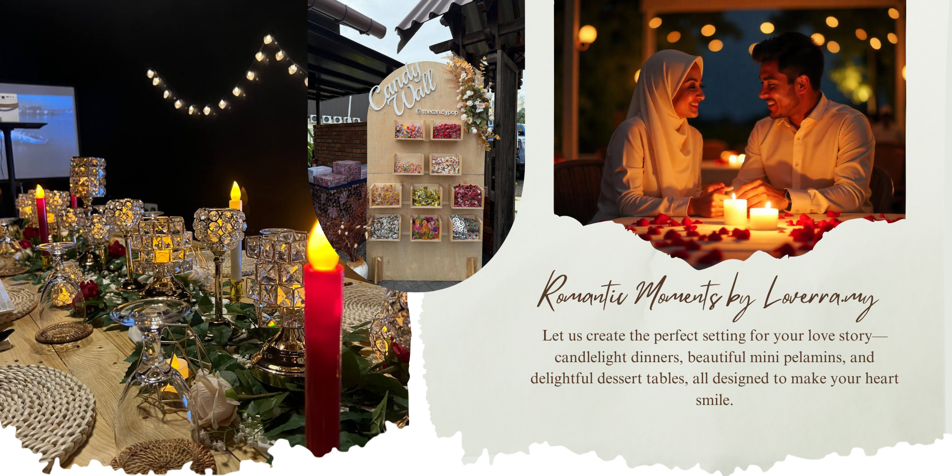 At Loverra.my, we believe that love deserves to be celebrated beautifully. We specialize in creating memorable event experiences through thoughtfully curated packages such as romantic candlelight dinners, elegant mini pelamins, and charming dessert tables.